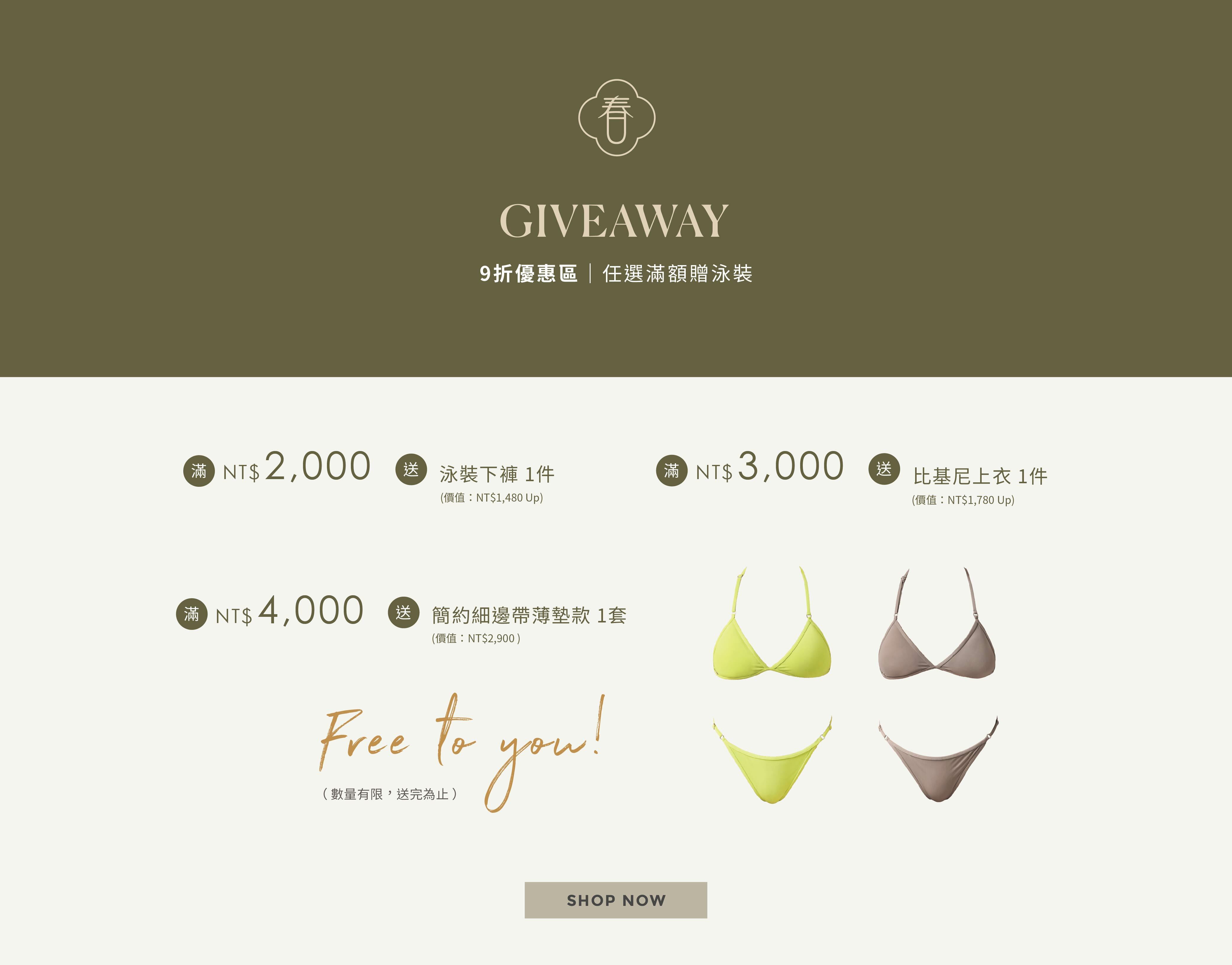 滿$2000 送:泳裝下褲1件 / 滿$3000 送:比基尼上衣1件 / 滿$4000免運 送:簡約細邊帶款泳裝 1套+全台免運(贈品數量有限,送完為止)